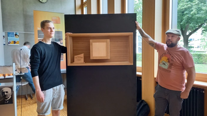 Besonders beeindruckte sein Gesellenstück: ein formschöner Rahmen, der sich um ein eintüriges Korpuselement mit innenliegender Schublade drehen lässt – ein Beweis für sein handwerkliches Geschick und seine kreative Gestaltungskompetenz.